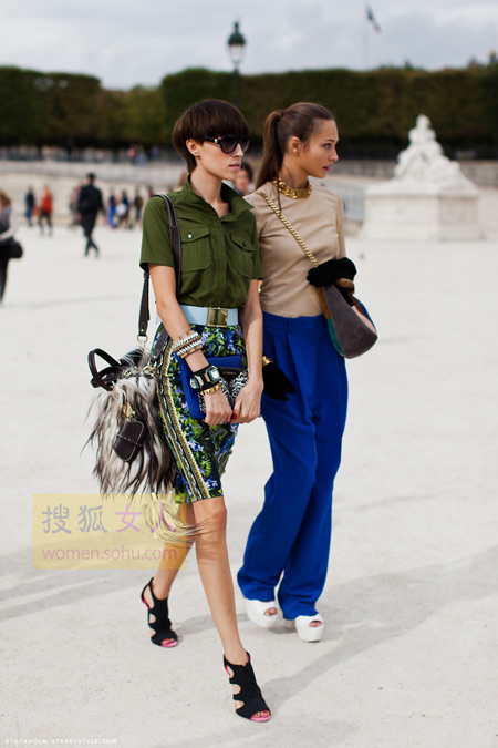 编辑解析:中高腰的印花铅笔裙更易显腿长,如果选择颜色较为浓郁的花纹的话,上半身最好选择深的素色,这样的配色更大气稳重,对于职场女性更适宜。