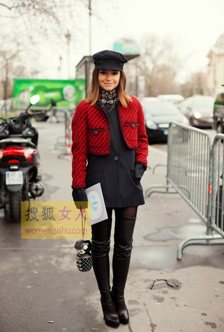 编辑解析:传统的花呢外套改良成短款以后更适合个子娇小的亚洲女生了,高腰线简直就是显高的法宝嘛~再来短裙长筒靴,怎么显瘦显高就怎么穿!