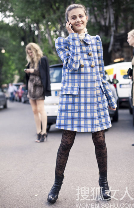 编辑解析:这款格纹呢外套,圆领、公主袖以及双排扣的设计,都是少女风必备的元素,蓝白的配色更是显白显小不少。与蕾丝的搭配更是弥漫浓浓少女风情。