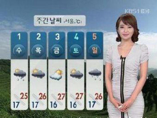 同时韩国KBS电视台气象节目主持人的“拉链服装”引起争议。