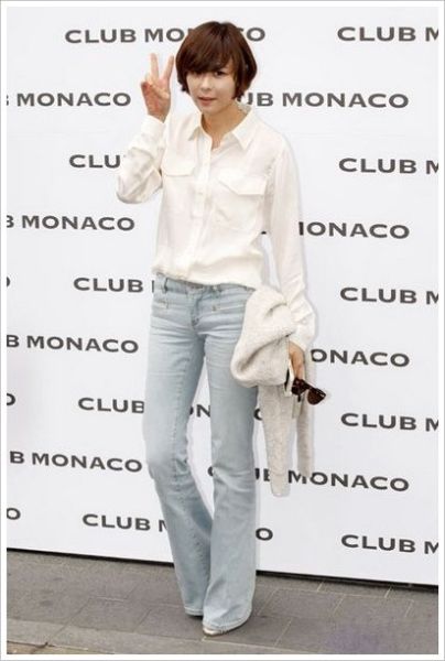 纯色衬衣搭配高腰喇叭牛仔裤非常大气地显示出了崔江熙的穿着品味