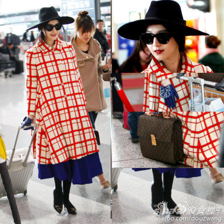 范冰冰启程巴黎看秀 红白格大衣气场十足