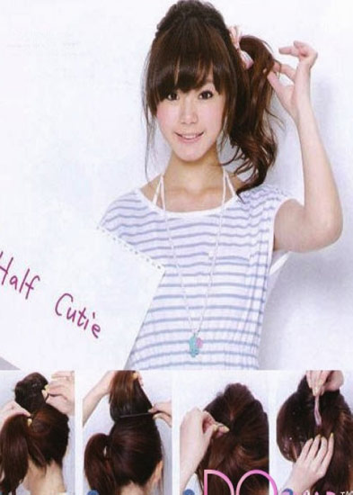 (2)把马尾作出卷度,头顶的蓬松蓬度可以增加有点小成熟的大人感觉,马尾的漂亮卷度可以增加女孩甜美感。
