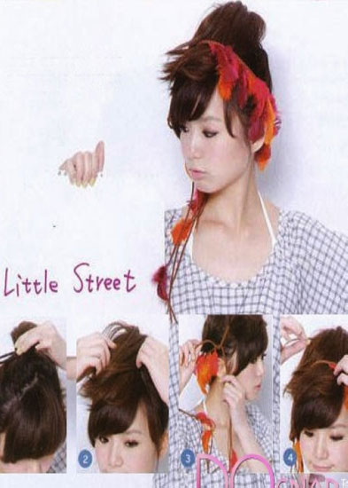 这个发型要注意的地方是,因为高马尾往前放的造型一不小心很容易会显得太过街头或个性,所以“前侧刘海是一定要的”,因为大片刘海可以加入可爱风,之后再选色彩缤纷羽毛装饰的发带便OK了!