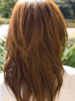 背影:呈尖状,轻轻打薄了发尾和头发的外层,营造发梢飘逸的美感,蓬松的造型既塑造了女性柔美的一面,也突显了活泼感。