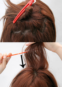 将顶部留出的头发用发夹夹在马尾辫的发根部,然后按图片所示往上拉头发使之显得蓬松些。如果怎么弄头发都蓬松不起来的话可以事先用梳子逆梳1-2次头发。