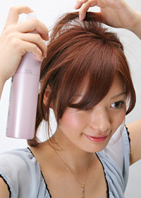 喷上啫喱水以保持顶部的蓬松状态,注意要从头发的内侧喷进去而不是喷在表面上。
