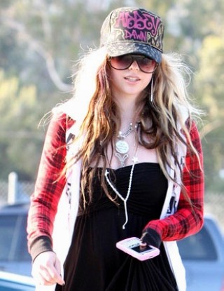 这个搭配是典型艾薇儿的范儿。朋克风格的卷发张扬有个性,但是却搭配上了运动感十足的涂鸦LOGO棒球帽。棒球帽似乎掩盖不了朋克卷发的势头,张扬的个性尽显其中。如果想要打造艾薇儿式的朋克卷发,还可以在颜色上花些心思,挑染一些靓丽颜色会让整体看起来更出挑。