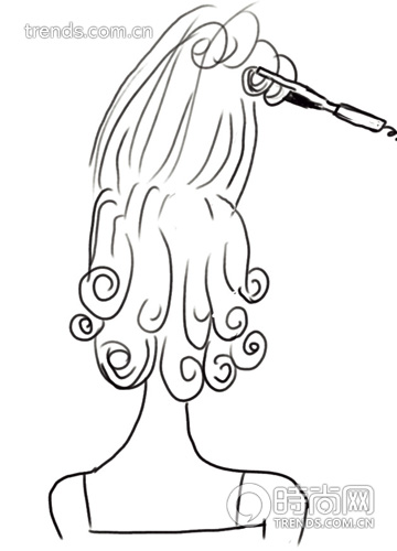 1。将头顶处1/2头发夹起,以下头发用卷发棒夹成不规则卷。头顶处头发做同样处理。