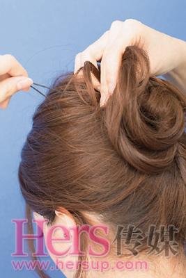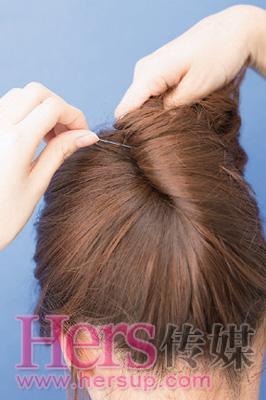 将头发拧到上方盘起,头发梳成一束,拧一圈后用2枚发卡分别在底部及中间固定。