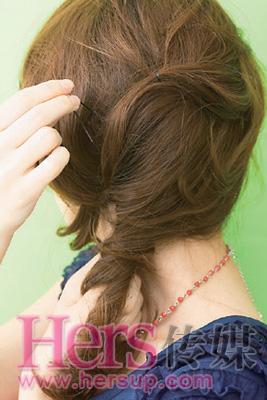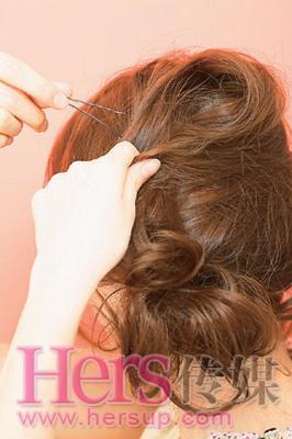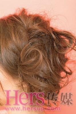 上半部分也固定在左侧,余下的头发轻轻捻一下做出蓬松感,同样用发卡在左耳上方固定。
