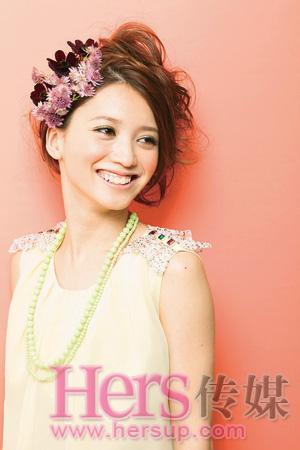 大胆将鲜花作为发型的配饰。将头发从后面分成两部分,横向拧卷后插入发卡。
