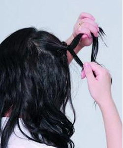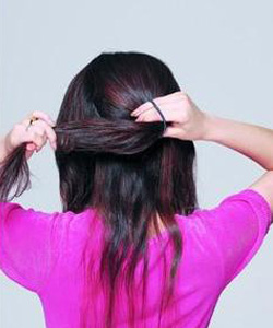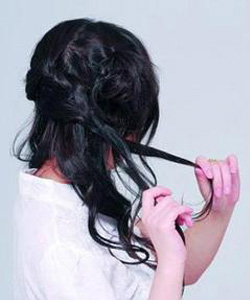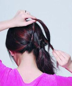 2、留出的头发,除了在耳后继续留出一缕,其余的如图分成两股,每一股都向里绕转,然后交叉缠绕在歪马尾扎皮筋的地方,把发梢儿塞到皮筋里固定。