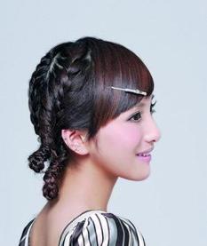 2、将另一侧的头发分成三股,横向编发,将发尾固定在下面的发髻上。