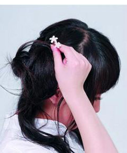 1、在头顶的一侧揪出一撮头发,分成大小两缕,用小的那缕绕在大的那缕上,然后用发卡固定。