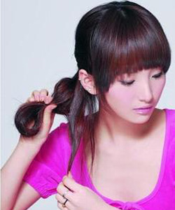 1、如图,用皮筋扎成歪马尾,周围一圈都要留出一些头发。