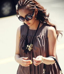 点评:高高耸起的发髻,以红色头绳绑定,一点点复古的感觉,个性又前卫。带点大牌的明星味道,依稀记得早年的王菲曾有过这样的发型。