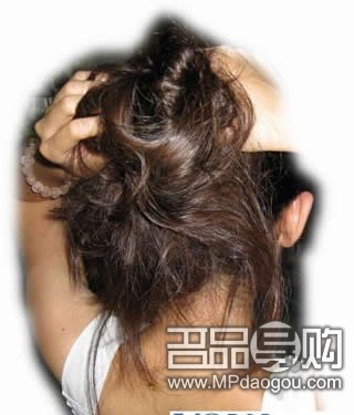 细节1:右手(无所谓哪个手先开始)从最下往上松松的托起头发至左手处后扣住,左手同理,直至基本都抓上来。