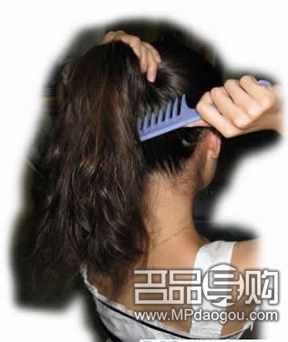 细节2:用大齿的梳子把后脑勺的碎头发稍微归拢一下,系上两根超细的黑皮筋,马尾辫就OK啦。