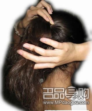 细节1:先找好发髻高度,把头仰到最大限度,食指地方为佳,这个高度也因人而异。然后把下面的头发都归拢到这个位置,马尾辫的位置就找好了。