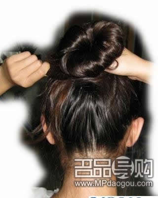 细节2:左手(左右无所谓)成C字形将头发扩开后,抓住发髻底部头绳处,右手同理,直到出现花苞状,把剩余的头发缠绕到发髻根部。