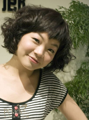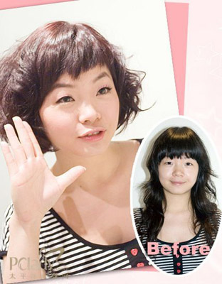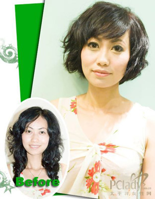 After:变发后的这款发型也将是09年秋冬流行的短发类型之一。这款短BOB的卷发质感很好的体现了时尚气息,短发的时尚气息与这位MM的气质更贴近,沉闷的长卷是MM显得老气,人也显得不精神。特别是这款发型的刘海,很好的解决了MM额头过高刘海难打理的烦恼,同时这款发型也显得脸更尖了。
