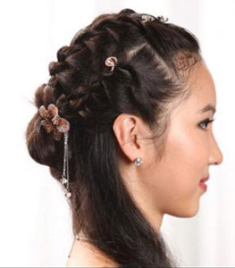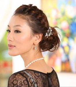 瘦脸型,这种脸型切忌呆板的把头发束在脑后,那样显得脸长且没有生气。可如图中女主角一样在头顶处适当作些编辫处理,再把头发在头右侧盘起来,拉些发丝做出蓬松效果。再配以闪亮的发夹和耳饰,显得时尚优雅,魅力逼人。这个造型非常有特色,熟女的万千风情展现的淋漓尽致。