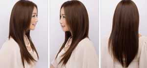 正面效果:帖服而略带厚重感,但不是死板的直发,而应略带韵律美,帖服的秀发在发梢处微微内卷,很好的修饰脸型,以及烘托整体气质。中分的长刘海露出饱满的额头,显得精神很好,并且给人的感觉拥有丰富的知识底蕴,散发着淡雅脱俗的魅力,闪耀着知性的光芒。