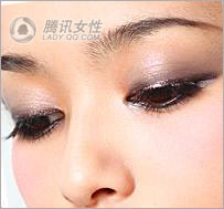 大面积地运用闪亮的烟灰色烟熏妆来凸显深邃立体的电眼,在眼头及眉下点上一丝暗粉色增添可爱感,唇部则选择淡淡的粉色展现粉嫩的唇色即可。