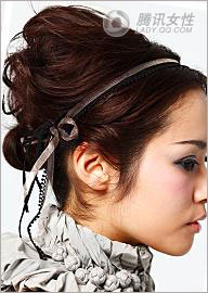 过于紧致服帖的盘发只会让你看上去老气横秋,将秀发松散凌乱地盘起,顶部用手抓出一定的高度及蓬松感,再搭配上别致的发带,会让你充满慵懒的女性气息。
