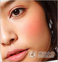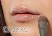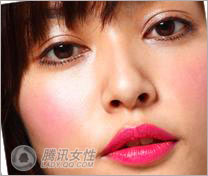 妆容的重点在于唇妆。不需要描画唇部轮廓,先用遮瑕膏遮掩黯淡的唇色,然后直接用手涂抹半透明状的朱红色唇彩于唇部中央,强调出健康红润的唇色,打造少女般纯真的粉嫩红唇。