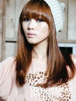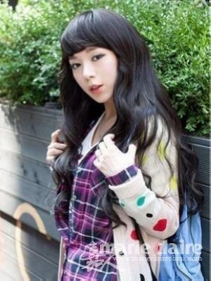 推荐理由:齐刘海风貌似在这个季节又卷土重来了,不管长发短发,直发卷发,MM们都喜欢搭上一个稚嫩的齐刘海,不仅掩龄,还能瘦脸。这款发型聪明地利用了分层的发段,先利用齐刘海遮住了额头,脸看上去就小了一半,分层的发段将人的视觉拉到头发上,脸自然就变小了。