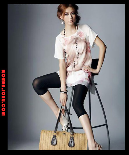 搭配建议:轻松的雪纺,清凉透气,胸前漂染的人像图案,色泽亮丽柔和,首饰点缀,个性闪亮。
