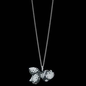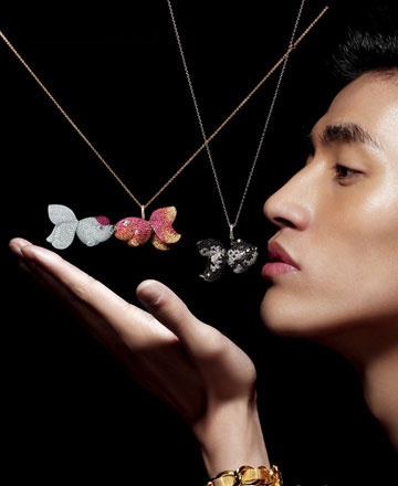 继Ling Long、Bo Bo、莲藕、Wu Lu、Tien Di之后,个性珠宝品牌Qeelin的第六个产品logo在设计成品终于登陆北京。延续以前多数产品的拼音英文的命名方式,这次的真爱之作系列叫做“Qin Qin”,即普通话的“亲亲”。 Qin Qin的创作灵感来自于Qeelin设计师陈瑞麟对于金鱼文化的热爱,他认为,天上的彩虹是世间最绚丽多彩的,可金鱼除了具备赤、橙、黄、绿、青、兰、紫外,还多了黑、白、金和银色等,且这些颜色在金鱼身上是那么鲜艳且富于变化。在普通的光线下,它们表现得像质地细腻的丝绒,色彩浓重,一旦被阳光照射,它们会迸发出金属和宝石般的光芒,可见金鱼就是天然的“珠宝”。