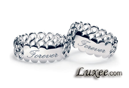 刻有"Young"(青春)和"Forever"(永驻)字样。女款婚戒戒臂上镶嵌有一圈精致碎钻。