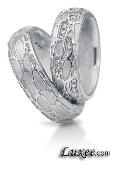 表面纹理极富质感,镶嵌专门为"她"而呈现的明亮琢型钻石。在2009 Inhorgenta Europe国际珠宝展览会上,该款设计荣获国际铂金协会(PGI)德国分会授予的铂金婚戒类"2009最受欢迎铂金设计"大奖。