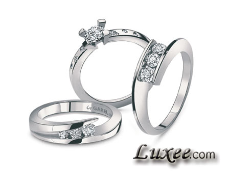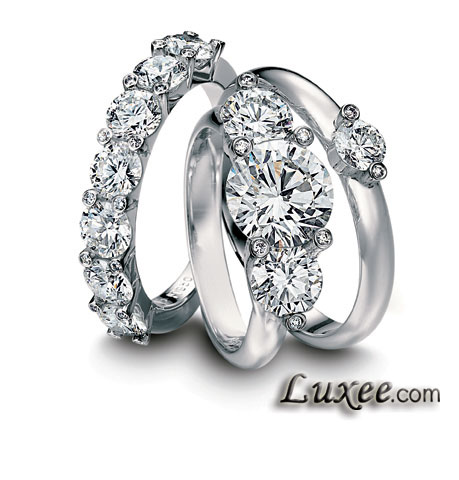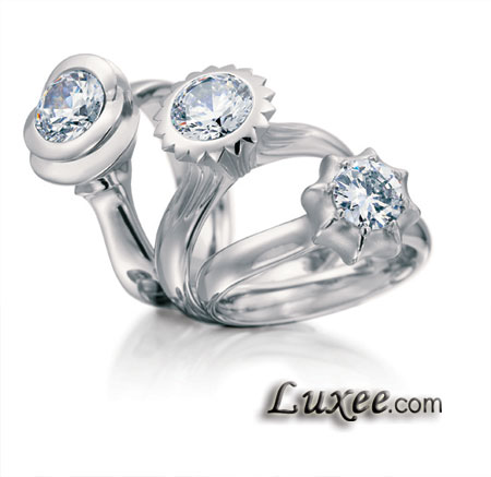 从左至右依次为:"玫瑰骑士"(The Knight of the Rose)--玫瑰型指环设计,镶嵌单颗明亮琢型钻石(1.5克拉);"百变褶裥"( Pleats)--镶嵌单颗明亮琢型钻石(1.5克拉);"灰姑娘"(Cinderella)--镶嵌单颗明亮琢型钻石(1.0克拉)。