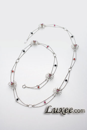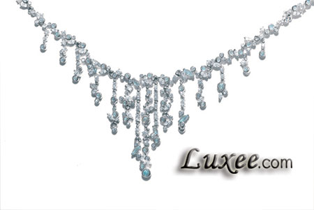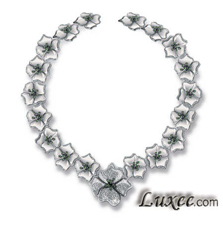 镶嵌有149颗包镶璀璨钻石(总重5.79克拉)和水绿磷灰石(总重7.92克拉)等彩色宝石。季风气候带来的丰沛雨水为色彩斑斓的水光湖色平添一份动感与活力,"季风"系列正是对这样一种浪漫奔放气候的礼赞。项链部分就像一串串雨滴,灵动,轻盈,充满律动感。