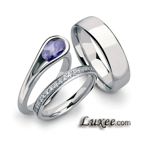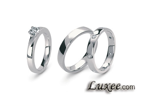 女款戒指镶嵌单颗钻石,与结婚对戒完美贴合。三指环均进行抛光处理。
