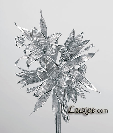 纹理优雅,玫瑰花瓣线条柔美,铂金的典雅光泽为新娘捧花平添一份美丽与璀璨。