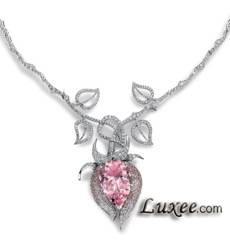镶嵌有一颗梨形摩根石(18.9克拉),周边环绕一圈粉色碎钻(总重1.9克拉)和白色碎钻(总重7.27克拉)。