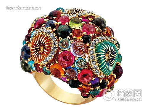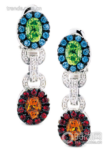 过去的色彩规则再也不适用当今高级珠宝中彩色宝石的Mix &Match了,现在的设计师用更加自由的色彩转盘打破了色彩预测的规则。多样的色彩出现在小小的一件珠宝上,却可呈现出完美和谐的视觉美感,这也使佩戴者更容易与多色的服装进行搭配。黄色、紫色、蓝色、绿色,这些相撞的颜色放在一起却美艳无比,毫无疑问,过去的禁忌已成为今日的时尚。