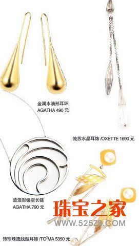 以水流的线条为设计灵感的首饰,多为流线型设计,同时线条感强,但在如此灼热的夏天,越简洁、越轻快的款式越受欢迎,哪怕只是一条曲线的耳环。避免选择线条过于复杂纷乱款式的首饰。