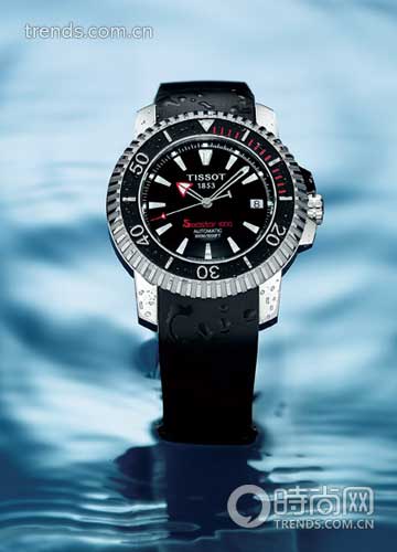 天梭的海星潜水1000自动表,时标上的荧光涂层设计成天梭标志性的“T”