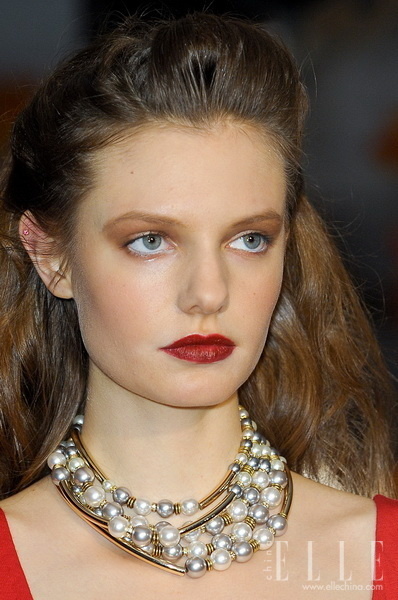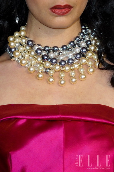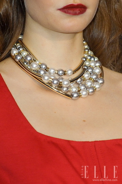 大颗粒的仿珍珠比起自然珍珠来说,造型感与色彩感能更加丰富,也易于混搭。2012秋冬的秀场上,灰色与白色是珠宝的主色调,搭配火红的裙装,一个热情性感的女性造型就油然而生。