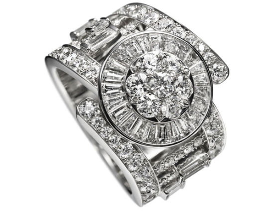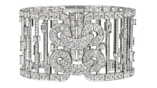 以中国旗袍的盘扣为灵感设计的手镯,镶嵌有高达700颗钻石。