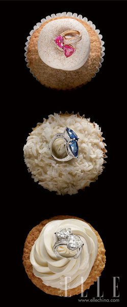 三枚戒指被放在了纸杯蛋糕之上,纯白的奶油让人联想起了甜蜜,而珠宝则像是点缀的甜品水果。
