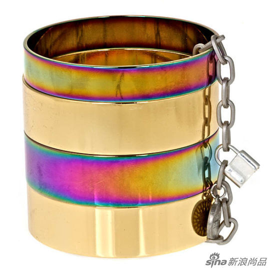 金属环和鳄鱼皮的搭配让人眼前一亮,粗细不同的手镯搭配起来佩戴会收获意想不到的效果。