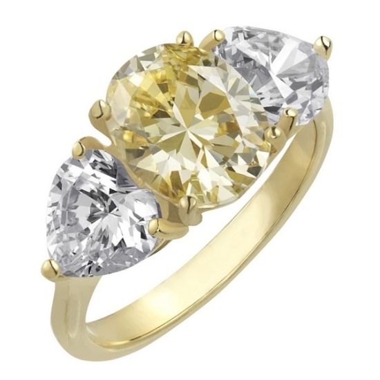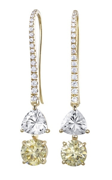 Brillante耳环每边以3.7克拉淡黄色圆形晶钻配合3.2克拉白色三角形晶钻,加上黄金色底座,更颢率性女生的自信与快乐。Brillante吊坠同样以淡黄色圆形晶钻及白色三角形晶钻组合为重心,而戒指则换上白色心形晶钻,更显男士心意。