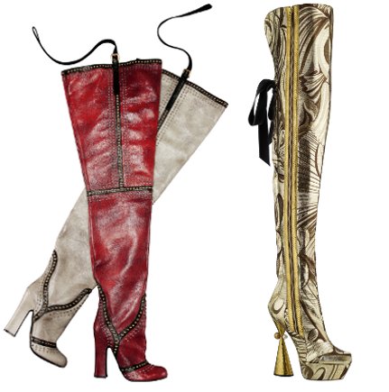 如果你更加大胆的话,你可以选择Prada的Cracle Roxy长靴(港币19,000),或者是LV的金色纹身图案长靴(港币35,500),它们绝对是本季值得一试的单品。